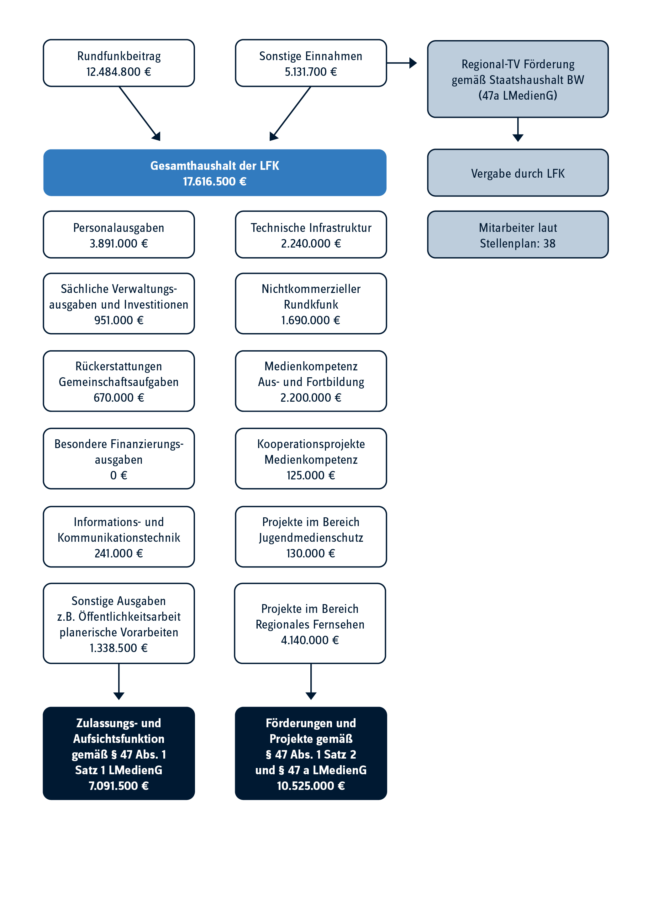 Der Finanzierungsanteil der LFK beträgt nach dem aktuellen Rundfunkfinanzierungsstaatsvertrag 1,8989 Prozent des Beitragsaufkommens Baden-Württembergs. Von diesem Betrag erhält die LFK 60,13 Prozent und der SWR die restlichen 39,87 Prozent.