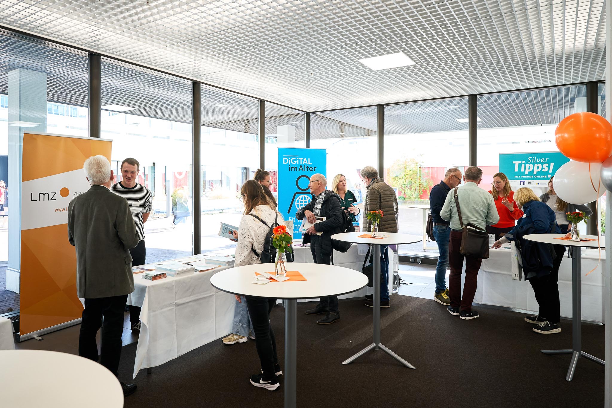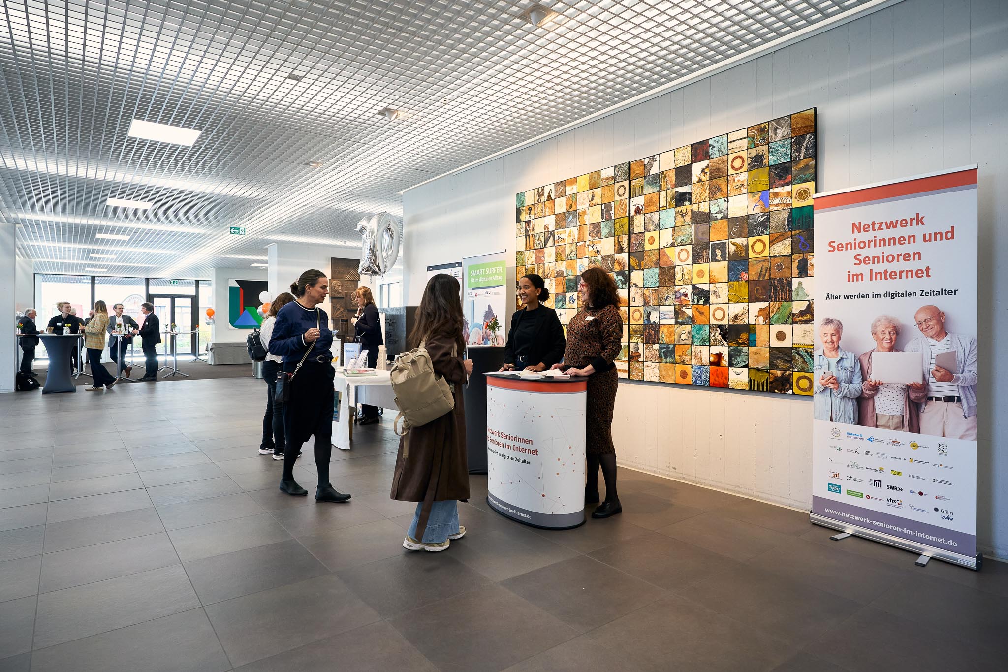 Besonders im Fokus der Jubiläumsveranstaltung standen kommunale Best-Practice-Beispiele, barrierefreie Medienangebote und die Frage, wie digitale Bildung und soziales Engagement zusammengedacht werden können. In der abschließenden Podiumsdiskussion ging es darum, wie digitale Teilhabe auf lokaler Ebene konkret gestärkt werden kann. Die Teilnehmenden waren sich weitgehend einig, dass dies vor allem durch das Bereitstellen von Begegnungsorten, starke lokale Netzwerke, ehrenamtliches Engagement und eine gezielte Quartiersentwicklung gelingen kann. Auf dem Markt der Möglichkeiten präsentierten die Netzwerkpartnerinnen und -partner Projekte, Materialien und Unterstützungsangebote zur digitalen Bildung im Alter.
